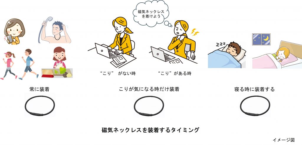日常的に肩こりを気にする方は、一日中の装着をおすすめします。一度装着すれば着脱の手間もかからず、生活の一部として自然に馴染みます。お風呂やスポーツ時も使用できるタイプを選べば、日中の活動中からリラックスタイムまで、磁気が肩や首のこりに働き続けます。