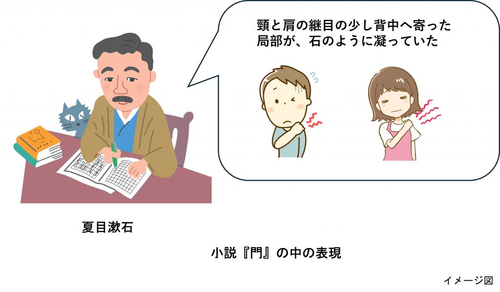 さて、「肩こり」という言葉が世間一般に広く使われるようになった時期には諸説ありますが、最も有名な説として、文豪・夏目漱石が1910年(今から約116年前)に発表した小説『門』の中の表現が普及のきっかけになったと言われています。「肩こり」の名称の元になったとされる記述は作中の『頸と肩の継目の少し背中へ寄った局部が、石のように凝っていた。』というものです。この文学作品を通じて、それまで表現しづらかった首から肩にかけての不快な症状が、「肩こり」という一つの言葉で広く認識されるようになりました。