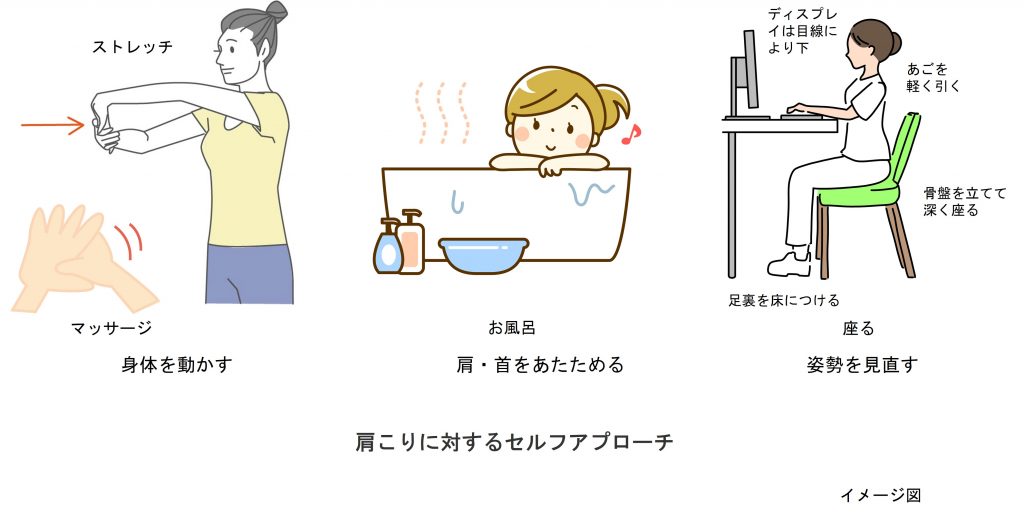 肩こりには、筋緊張の緩和と血行改善が有効です。身体を動かす、温める、姿勢を見直すといったセルフアプローチを推奨します。下記1~3を行いましょう。