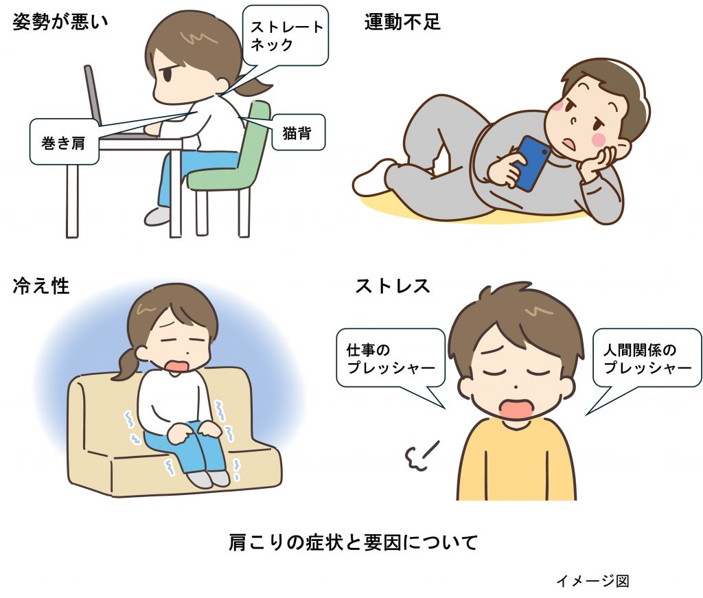 「肩こり」は、姿勢が良くない人(例:ストレートネック、巻き肩、猫背)、運動不足、冷え性、ストレスになる傾向があると言われています。その症状ごとに“肩こり”になる要因について解説します。