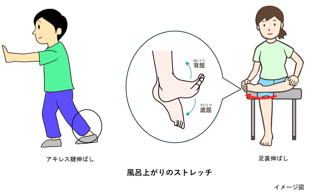 次に、帰宅後のお風呂上がりにおすすめのストレッチです。ふくらはぎは「第二の心臓」と呼ばれ、血流のポンプ作用を担っています。ここを緩めることは、全身の巡りを整え、遠く離れた肩の荷を下ろすことにつながります。ストレッチを2種類紹介します。